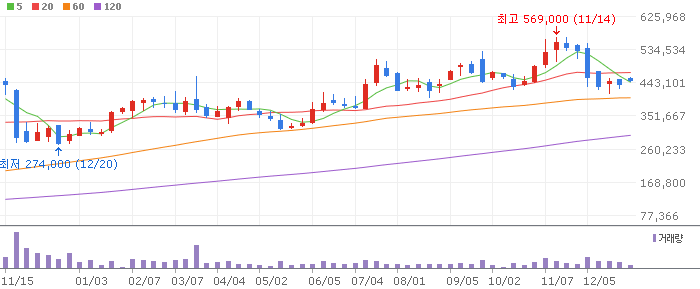 - 주봉 차트 분석: 역사적 신고가 부근에서 강력한 지지선을 형성하고 있습니다. 기관과 외국인의 매수세가 유입되는 '바이오 대장주'입니다.